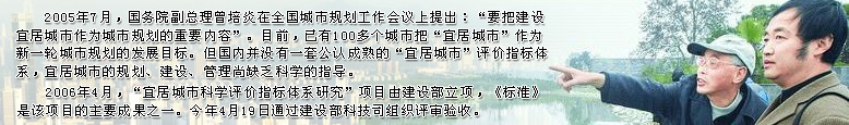 《宜居城市科學(xué)評價標(biāo)準(zhǔn)》30日發(fā)布 新華網(wǎng)北京5月30日電由中國城市科學(xué)研究會研究編訂的《宜居城市科學(xué)評價標(biāo)準(zhǔn)》于4月19日通過建設(shè)部科技司組織評審驗收之后,30日正式對社會發(fā)布。至此,我國宜居城市的規(guī)劃、建設(shè)、管理有了一個導(dǎo)向性的科學(xué)評價標(biāo)準(zhǔn)。