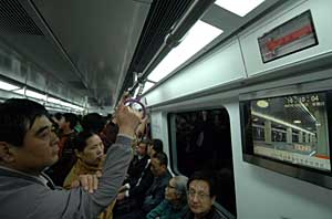 | 10月7日,北京地鐵5號線下午2:00正式售票開通試運(yùn)營,軌道交通全路網(wǎng)票價2元.北京市民可以乘坐地鐵直接從城南豐臺區(qū)的宋家莊到達(dá)城北昌平區(qū)的天通苑。圖為乘客正在看5號線地鐵車?yán)锏娘@示器。新華社記者