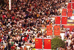 今年“十一”黃金周,全國共接待旅游者1.46億人次。圖為游客在上海南京路步行街參加國慶觀燈活動。(新華社發(fā)) 短評