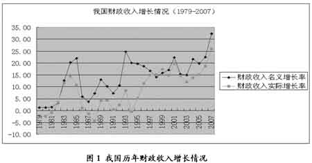 、7110.91萬(wàn)元,2007年實(shí)現(xiàn)財(cái)政收入5.13萬(wàn)億元,比上年增長(zhǎng)1.25億元。從增長(zhǎng)率來(lái)看,在不同年份存在波動(dòng),但近三年財(cái)政收入增長(zhǎng)率呈加速上升趨勢(shì),其中2007年名義增長(zhǎng)率從2006年的22.47%提高到32.36%,提升了近10個(gè)百分點(diǎn),實(shí)際增長(zhǎng)率(實(shí)際財(cái)政收入是以GDP平減指數(shù)剔除價(jià)格影響后的實(shí)際值)從2006年的18.62%提高到26.08%,提升了7.5個(gè)百分點(diǎn)。也就是說(shuō),從增長(zhǎng)的絕對(duì)指標(biāo)和相對(duì)指標(biāo)兩方面分析,能夠得到2007年財(cái)政收入超常規(guī)增長(zhǎng)的結(jié)論。(見(jiàn)圖1) 與GDP的增長(zhǎng)對(duì)比來(lái)看,改革開(kāi)放以來(lái),我國(guó)GDP實(shí)現(xiàn)了較大增長(zhǎng),2007年GDP達(dá)到24.66萬(wàn)億元,比1978年的3645.2億元增長(zhǎng)了66.7倍,比2002年增長(zhǎng)65.5%。近五年來(lái),我國(guó)GDP年均增長(zhǎng)10.6%,而名義財(cái)政收入年均增長(zhǎng)21.09%,實(shí)際財(cái)政收入年均增長(zhǎng)16.69%,相比之下,財(cái)政收入增長(zhǎng)速度明顯高于GDP的增長(zhǎng)速度。財(cái)政收入占GDP的比率在改革開(kāi)放后的20年間持續(xù)下降,從1978年的31.06%下降到1996年的10.41%,1997年這種下降勢(shì)頭開(kāi)始得到扭轉(zhuǎn),并在近10年間穩(wěn)步上升,從1997年的10.95%上升到2007年的20.8%,年均上升約1個(gè)百分點(diǎn),尤其是2007年該比率比2006年上升了2.4個(gè)百分點(diǎn),表現(xiàn)出明顯加速的勢(shì)頭。從增量對(duì)比來(lái)看,財(cái)政收入增量占GDP增量的比重近五年逐年升高,其中2006、2007兩年顯著上升。 我國(guó)財(cái)政收入占GDP比重的升高以及財(cái)政收入與GDP的相對(duì)增長(zhǎng)速度加快說(shuō)明財(cái)政集中程度和財(cái)政能力在提高,但同時(shí)也可能加重經(jīng)濟(jì)的超額負(fù)擔(dān),因此,財(cái)政收入持續(xù)快速增長(zhǎng)對(duì)宏觀經(jīng)濟(jì)和微觀經(jīng)濟(jì)是否存在較大的負(fù)面影響成為社會(huì)關(guān)注的焦點(diǎn)。
