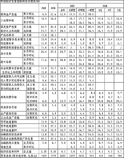 注:工業(yè)增加值的季度和月度數(shù)為國有工業(yè)和產(chǎn)值在500萬元以上的其他工業(yè)企業(yè);固定資產(chǎn)投資季度數(shù)和月度數(shù)的統(tǒng)計口徑為城鎮(zhèn)50萬元以上項目的投資;農(nóng)村居民收入的季度數(shù)為現(xiàn)金收入;部分當(dāng)月指標(biāo)為估算數(shù)。 | 5月份,我國經(jīng)濟(jì)總體狀況基本穩(wěn)定,居民消費(fèi)價格漲幅明顯回落,貨幣供應(yīng)量M1的增長呈緩慢回落走勢,但進(jìn)出口增長速度明顯加快。有兩個因素對當(dāng)月經(jīng)濟(jì)狀況構(gòu)成了較大沖擊,一是汶川大地震對宏觀經(jīng)濟(jì)的影響;二是取消“五一”長假的影響。必須考慮到這兩個因素的影響后才能作較為準(zhǔn)確的判斷。