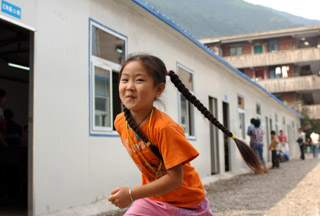 9月1日,在漢中市略陽縣高臺(tái)小學(xué),一名小學(xué)生在活動(dòng)板房教室前玩耍。當(dāng)日,陜西地震災(zāi)區(qū)漢中市2191所中小學(xué)、幼兒園全部按時(shí)開學(xué),所有師生將在安全的校舍上課和食宿。新華社記者:丁海濤 攝