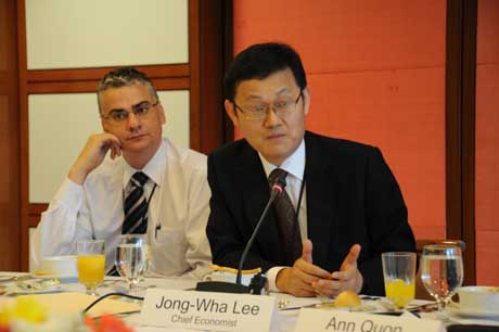 7月2日,亞洲開(kāi)發(fā)銀行首席經(jīng)濟(jì)學(xué)家李鐘和(右)在位于菲律賓首都馬尼拉的亞行總部接受媒體采訪時(shí)說(shuō),受外部經(jīng)濟(jì)形勢(shì)不明朗、原油和其他一些商品價(jià)格上漲等負(fù)面因素影響,亞洲發(fā)展中經(jīng)濟(jì)體的復(fù)蘇之路將漫長(zhǎng)而艱難。