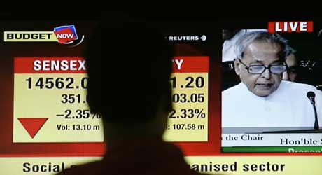 7月6日,在印度東部城市加爾各答,一名股票交易員觀看印度財(cái)政部長(zhǎng)普拉納布·慕克吉在議會(huì)宣布新預(yù)算案的電視報(bào)道。慕克吉當(dāng)日在議會(huì)宣布了印度新政府成立后的第一個(gè)預(yù)算案,部分延續(xù)了上屆政府的經(jīng)濟(jì)刺激措施,并加大對(duì)農(nóng)業(yè)和貧困人口福利等社保收入。 新華社/路透 |