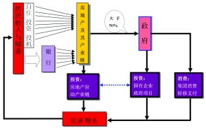 我們現(xiàn)在來考察國民儲蓄是怎樣借助于房地產(chǎn)業(yè)轉(zhuǎn)化成投資,特別是政府投資的。如圖5所示,居民因?yàn)樽宰、投資或者投機(jī)等動機(jī)而購買房地產(chǎn),居民收入和儲蓄以購房款和銀行給房地產(chǎn)商貸款的形式大量地進(jìn)入房地產(chǎn)及其產(chǎn)業(yè)鏈。如果綜合考慮房地產(chǎn)及其產(chǎn)業(yè)鏈的收入循環(huán),應(yīng)該有超過50%以上的資金直接或間接地、或早或晚地流入到政府手里。流入政府的資金又有兩部分支出,一部分形成政府的投資,投資到國有企業(yè)和政府項(xiàng)目里去,另一部分因履行政府職能而形成的正常開支(工作人員的工資、集團(tuán)消費(fèi)和轉(zhuǎn)移支付等)。流入房地產(chǎn)業(yè)的其余資金經(jīng)房地產(chǎn)產(chǎn)業(yè)的循環(huán),進(jìn)行投資。我們知道,中國經(jīng)濟(jì)的增長在很大程度上依賴于投資,而投資中很大一部分是屬于政府的直接或間接投資。政府投資在中國經(jīng)濟(jì)增長中的極端重要性,在這次經(jīng)濟(jì)刺激計劃中得到了最好的注釋。 2009年預(yù)計有5.8萬億的巨額資金直接進(jìn)入房地產(chǎn)業(yè),此外,還有更大規(guī)模的社會儲蓄通過銀行貸給開發(fā)商及相關(guān)產(chǎn)業(yè)。房地產(chǎn)業(yè)及其產(chǎn)業(yè)鏈將其中的一大部分資金分流給了政府,政府以此進(jìn)行投資,另一部分流到房地產(chǎn)相關(guān)產(chǎn)業(yè)。中國社會中最巨額的儲蓄和中國老百姓中最大量的資金是通過房地產(chǎn)業(yè)進(jìn)入經(jīng)濟(jì)中的。因此,房地產(chǎn)業(yè)是我國現(xiàn)行經(jīng)濟(jì)增長模式中,將社會儲蓄轉(zhuǎn)化為投資,特別是政府投資的最大的轉(zhuǎn)化器。房地產(chǎn)的價格上漲是保證各級政府收入的需要,是巨額投資的資金來源,是我國目前經(jīng)濟(jì)增長模式的最重要支撐。如果改變房地產(chǎn)業(yè)的現(xiàn)狀,必然嚴(yán)重沖擊現(xiàn)行的經(jīng)濟(jì)增長模式。換一種說法,如果在經(jīng)濟(jì)增長模式作出適應(yīng)性調(diào)整之前,房地產(chǎn)業(yè)的重大調(diào)整將帶來經(jīng)濟(jì)增長模式的崩潰。這也是很多人用來維護(hù)房地產(chǎn)業(yè)現(xiàn)行運(yùn)行格局的理由。