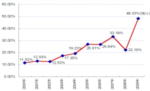 房地產(chǎn)關(guān)系到千家萬戶,關(guān)系到很多年輕人的基本生存需要,連續(xù)多年的房地產(chǎn)價格快速上漲引起了越來越廣泛的社會關(guān)注。在這里,我不打算談房價是漲還是跌,而是想從一個不同的角度來探討,到底怎樣看待房地產(chǎn)業(yè)的性質(zhì)?它的經(jīng)濟(jì)后果是什么?它的社會后果又是什么?最后我提幾點(diǎn)政策建議。 房地產(chǎn)業(yè)涉及的范圍很廣,是巨大的財富“吸金器”。從一個特定的時間截面上來說,購房會涉及到年輕夫婦雙方的父母,甚至雙方的爺爺奶奶,還有雙方的親戚朋友;從時間跨度上來說,房地產(chǎn)通常會涉及到一對夫婦過去幾年甚至更長時間的差不多所有的積蓄,同時也會涉及到他們未來十幾年甚至更長時間的收入(銀行按揭把他們未來的預(yù)期收入折現(xiàn)到現(xiàn)在的房子里)。 同時,房地產(chǎn)業(yè)涉及的資源金額很大,是規(guī)模最大的單項(xiàng)商品。2009年商品房年銷售額預(yù)計會達(dá)到5.8萬億(圖1)。此外,從老百姓的開支來看,2009年房地產(chǎn)消費(fèi)占居民消費(fèi)的比例預(yù)計達(dá)到48.33%,接近一半(圖2)。也就是說,房地產(chǎn)對經(jīng)濟(jì)社會、對老百姓等方方面面來說,都是一件很大的事情。 房地產(chǎn)把中低收入階層老百姓的財富基本吸光了,現(xiàn)在很多人變成了“房奴”。這大大加劇了業(yè)已存在的收入分配的不平衡。從1992年到2008年期間,如果把1992年標(biāo)準(zhǔn)化為100,則2008年農(nóng)村人均純收入是607,城鎮(zhèn)人均可支配收入是779,城鎮(zhèn)+農(nóng)村的人均收入是870,而財政的收入(預(yù)算內(nèi))是1761,財政收入的增長幅度超出居民收入增長幅度的兩倍。