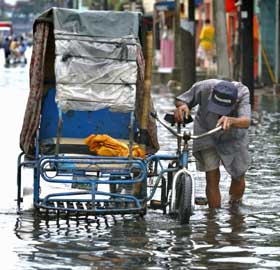 30日,在菲律賓首都馬尼拉郊外的馬拉邦,一名居民在強(qiáng)臺(tái)風(fēng)“西馬侖”帶來(lái)的積水中艱難行進(jìn)。當(dāng)天,強(qiáng)臺(tái)風(fēng)“西馬侖”繼續(xù)在菲律賓呂宋島北部肆虐,已經(jīng)造成至少2人死亡。