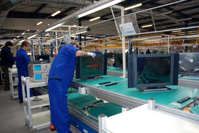 6日,在捷克的寧布爾克,幾名工人在四川長虹集團公司投資建設(shè)的電視機廠生產(chǎn)流水線上裝配電視。長虹在捷克首期興建的這家電視機廠建筑面積為3.3萬平方米,共有5條生產(chǎn)線,年產(chǎn)50英寸以下各種平板電視和CRT電視100萬臺。這也是四川長虹集團公司在歐洲的第一家工廠。