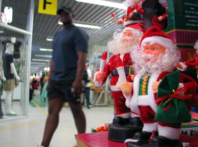 11日,在南非約翰內(nèi)斯堡的東方商城,購物者走過產(chǎn)自浙江義烏的圣誕老人玩偶。南非的圣誕禮品市場現(xiàn)已進入最紅火的銷售階段,中國制造的圣誕禮品因為物美價廉、品種多樣而受到當?shù)叵M者歡迎。