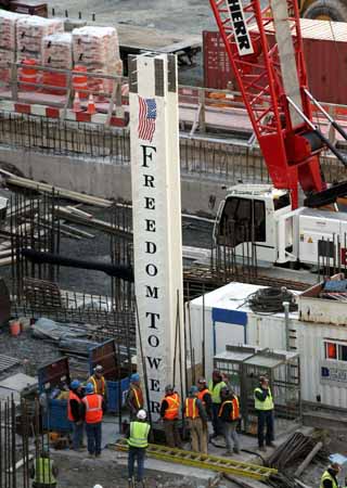 12月20日,在美國紐約新世貿(mào)中心主體建筑“自由塔”施工現(xiàn)場,工人們站在一根寫有“自由塔”英文字樣的鋼梁旁。19日,美國紐約世界貿(mào)易中心遺址豎起首批3根鋼梁,標(biāo)志著新世貿(mào)中心主體建筑“自由塔” 基礎(chǔ)工程動(dòng)工。
