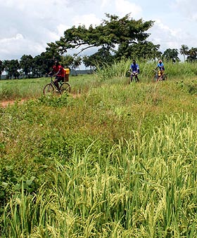 中墾集團(tuán)下屬的中幾農(nóng)業(yè)合作開(kāi)發(fā)公司自1997年起在幾內(nèi)亞首都科納克里附近的科巴農(nóng)場(chǎng)開(kāi)展水稻種植項(xiàng)目。幾年來(lái),科巴農(nóng)場(chǎng)不僅在解決幾內(nèi)亞人民吃糧難的過(guò)程中發(fā)揮了重要作用,而且?guī)椭車(chē)鷶?shù)百戶(hù)居民掌握了水稻種植技術(shù)。這是幾內(nèi)亞科巴農(nóng)場(chǎng)的工人騎車(chē)經(jīng)過(guò)即將豐收的稻田。新華社記者
