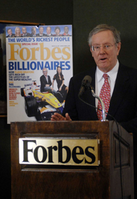 | 美國《福布斯》雜志近日公布2006年度全球個人財富排行榜,羅列了截至2月初個人資產(chǎn)市值達到或超過10億美元的946人。 按照排行榜制作者的說法,《福布斯》排行榜不只是個人財富的簡單羅列,同時也是全球經(jīng)濟及其變化的曲折反映。而近年來亞洲經(jīng)濟的蓬勃向上,也讓財富榜上涌現(xiàn)出越來越多的亞洲富豪。