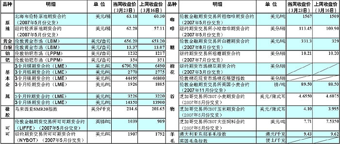 在美國(guó)汽油庫(kù)存持續(xù)下降、煉油廠(chǎng)原油需求增加、美聯(lián)儲(chǔ)決定將聯(lián)邦基金利率保持在5.25%水平不變,以及交易者擔(dān)心中東地區(qū)局勢(shì)更趨緊張等多重因素的共同作用下,當(dāng)周?chē)?guó)際油價(jià)總體呈上升之勢(shì)。 美國(guó)能源部21日公布的數(shù)據(jù)顯示,在截至3月16日的一周里,美國(guó)汽油庫(kù)存下降340萬(wàn)桶,包括柴油和取暖油在內(nèi)的其他成品油庫(kù)存下降170萬(wàn)桶。另外,當(dāng)周美國(guó)煉油廠(chǎng)設(shè)備開(kāi)工率為86.3%,比前一周有所上升。市場(chǎng)分析人士指出,這顯示在夏季汽油消費(fèi)高峰期到來(lái)之前,美國(guó)煉油廠(chǎng)正在擴(kuò)大生產(chǎn)。當(dāng)日,美聯(lián)儲(chǔ)還決定將聯(lián)邦基金利率保持在5.25%的水平不變,這有利于美國(guó)經(jīng)濟(jì)繼續(xù)保持增長(zhǎng),進(jìn)而有可能使得美國(guó)原油需求繼續(xù)保持旺盛勢(shì)頭,這些因素都推動(dòng)了油價(jià)走高。 此外,伊朗外交部23日證實(shí)于當(dāng)天早晨在海灣扣留了15名英國(guó)海軍人員,交易者擔(dān)心該事件可能導(dǎo)致中東地區(qū)局勢(shì)更趨緊張,這也成為推高油價(jià)的一個(gè)重要因素。 在美元走低和油價(jià)上漲雙重因素的影響下,黃金的期貨價(jià)格上揚(yáng),鉑、鈀等其他貴金屬價(jià)格也跟著走高;窘饘賰r(jià)格則是漲跌互現(xiàn),其中銅價(jià)和錫價(jià)升勢(shì)較猛:受中國(guó)需求增加等因素影響,銅價(jià)升至今年以來(lái)最高點(diǎn)——每噸6865美元;錫價(jià)也因主產(chǎn)地印度尼西亞國(guó)內(nèi)存在的生產(chǎn)問(wèn)題而升至歷史新高——每噸14351美元。 玉米、小麥以及大豆的價(jià)格紛紛上漲,艾倫代爾公司分析師喬·維克托認(rèn)為,由于預(yù)計(jì)需求仍然強(qiáng)勁,玉米和大豆價(jià)格的長(zhǎng)期走勢(shì)依然看漲。因市場(chǎng)擔(dān)憂(yōu)西非的可可收成可能較低,在投機(jī)性購(gòu)買(mǎi)因素的支撐下,倫敦和紐約兩地可可價(jià)格紛紛升至三年多來(lái)高點(diǎn)。同樣在投機(jī)性購(gòu)買(mǎi)因素的刺激下,咖啡價(jià)格上揚(yáng)。 由于出現(xiàn)不利于橡膠生長(zhǎng)的干燥天氣,再加上日本市場(chǎng)存在抬高價(jià)格的投機(jī)交易,橡膠價(jià)格被推高。