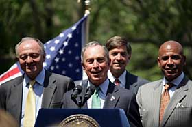 15日,美國紐約市長布隆伯格(中)在紐約中央公園出席記者招待會。當日,為體現(xiàn)環(huán)保主題,第二屆全球大城市氣候峰會在紐約中央公園舉行露天記者招待會。新華社記者