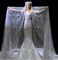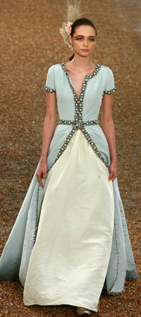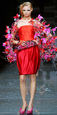 | 迪奧作品 | 另一位以創(chuàng)意大膽著稱(chēng)的時(shí)裝界“頑童”讓-保羅·戈蒂埃則在7月4日讓人們大開(kāi)眼界:一場(chǎng)純粹的女裝秀充滿了軍營(yíng)氣息,甚至約定俗成最后一位出場(chǎng)的新娘也被帶著頭紗的新郎代替。 肩章,金色紐扣,垂在胸前的飾帶,被特意“拓”寬的肩膀……奢華、嫵媚的裙裝有了這些裝飾,平添一股英氣。軍服領(lǐng)上衣搭配緊身褲與長(zhǎng)靴或者是帶褶痕、類(lèi)似男褲的長(zhǎng)褲,勃勃英姿呼之欲出。讓-保羅·戈蒂埃說(shuō),這場(chǎng)時(shí)裝秀體現(xiàn)了“女人才是強(qiáng)者”,因?yàn)榕丝梢栽谡宫F(xiàn)英姿的同時(shí)依然性感、敏感、浪漫。