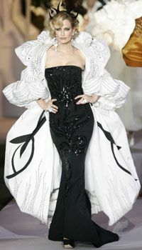 名設(shè)計(jì)師之所以有名,必有其不敗之處。例如,他們?cè)丛床唤、千奇百怪的?chuàng)意與構(gòu)思有時(shí)令人目瞪口呆,有時(shí)令人贊不絕口。 7月2日時(shí)裝周第一天,世界頂級(jí)時(shí)裝品牌迪奧為慶祝品牌誕生60周年,在巴黎近郊的昔日皇宮——凡爾賽宮內(nèi)舉行了一場(chǎng)時(shí)尚派對(duì),場(chǎng)面盛大,極盡奢華之能事。一批世界超模穿著令人眼花繚亂的華麗晚裝和上世紀(jì)40年代風(fēng)格的西裝亮相,仿佛一個(gè)個(gè)美人兒從畫(huà)中走出。也難怪,這些服裝的創(chuàng)意本就來(lái)自達(dá)·芬奇、畢加索、米開(kāi)朗基羅、莫奈、雷諾阿等大師的畫(huà)作,更何況它們出自迪奧的御用設(shè)計(jì)師——加利亞諾之手。舞臺(tái)背景音樂(lè)選擇了西班牙弗拉門(mén)戈舞曲,讓人憶起加利亞諾一半的西班牙血統(tǒng)。當(dāng)加利亞諾身著華麗的傳統(tǒng)斗牛裝束現(xiàn)身,時(shí)裝秀現(xiàn)場(chǎng)氣氛達(dá)到高潮——這是他的風(fēng)格,親自扮演最后一位讓人“驚艷”的模特。