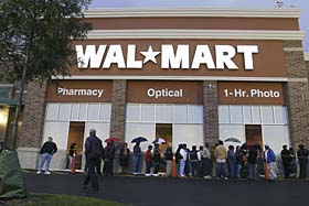 | 圖為美國芝加哥市民排隊進入沃爾瑪購物。本報資料照片 | 美國《財富》雜志7月23日一期將刊登2007年全球500強排行榜,根據其提前公布的排行榜榜單,盡管較去年有所變化,沃爾瑪、?松梨诘热蛑髽I(yè)均仍高居各榜單榜首位置,中國國家電網公司、中石油、中石化等眾多中國企業(yè)也位于各排行榜前列。