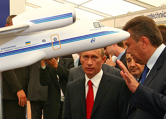 21日,在莫斯科市郊的茹科夫斯基舉行的俄羅斯第八屆國際航空航天展上,烏克蘭總理亞努科維奇(前右)陪同俄羅斯總統(tǒng)普京(前左)參觀烏克蘭生產(chǎn)的飛機的模型。當(dāng)日,俄羅斯第八屆國際航空航天展在此拉開帷幕。本屆航展共吸引來自39個國家的790家企業(yè)參展,參展商以實物樣品、模型、宣傳資料等形式展示了各型現(xiàn)代化飛機、航空武器、防空兵器和太空設(shè)備等。