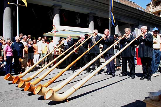 25日,幾位藝人在瑞士沃韋街頭吹響阿爾卑斯號角。當(dāng)日,沃韋舉辦第15屆街頭藝人節(jié),藝人們在沃韋老城街頭設(shè)立的7個(gè)演出點(diǎn)表演雜技、魔術(shù)等節(jié)目。
