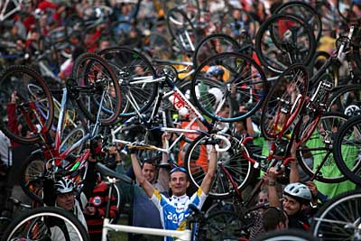 22日,匈牙利的自行車(chē)愛(ài)好者們?cè)谑锥疾歼_(dá)佩斯的一個(gè)公園里將自行車(chē)高高舉起。當(dāng)日,匈牙利的自行車(chē)愛(ài)好者們?cè)诓歼_(dá)佩斯游行,慶!盁o(wú)車(chē)日”。“無(wú)車(chē)日”又稱(chēng)“不駕車(chē)進(jìn)城日”,最早于1998年9月22日由法國(guó)率先發(fā)起。 | |