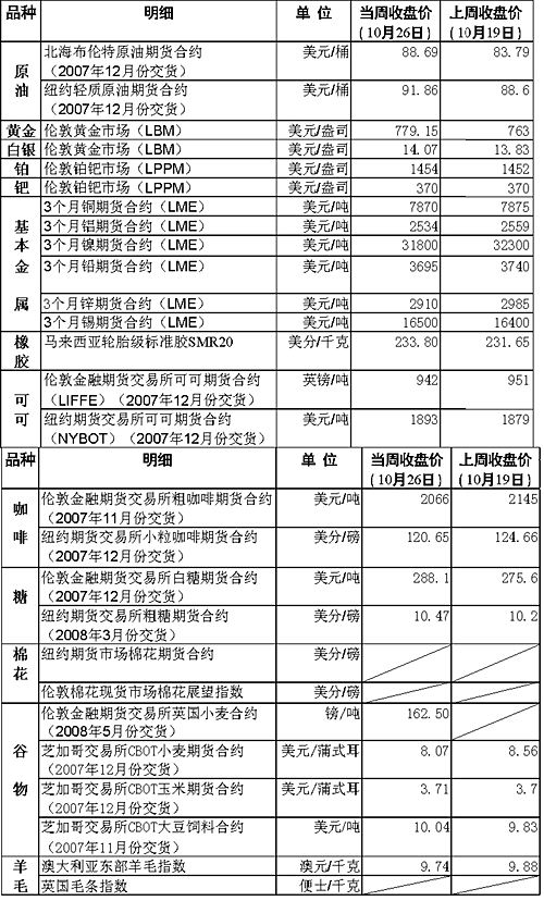 當(dāng)周芝加哥小麥期貨價(jià)格連續(xù)幾個(gè)交易日深度下跌,盤中一度跌破每蒲式耳8美元大關(guān)。分析師稱,這一方面是因?yàn)槿蛑饕男←溸M(jìn)口國可能在前一階段已購進(jìn)大量小麥,導(dǎo)致美國小麥的出口速度短期內(nèi)下滑;另一方面,有關(guān)澳大利亞小麥減產(chǎn)的消息已被市場吸收,同時(shí)小麥種植面積預(yù)計(jì)在明年又將大幅度增加,市場對未來供給的擔(dān)心因而得到緩解。 受中東局勢趨緊、美國原油庫存減少、美元走軟以及投機(jī)炒作等因素影響,當(dāng)周紐約市場原油期貨價(jià)格兩次創(chuàng)下收盤價(jià)新高。美國能源部24日公布報(bào)告稱,在截至19日的一周里,美國原油商業(yè)庫存猛降530萬桶,至3.166億桶,大大超出市場的預(yù)期。受上述因素影響,繼25日每桶大漲3.36美元并收于90.46美元之后,26日紐約市場原油期貨價(jià)格每桶又比前一個(gè)交易日上漲1.40美元,收于91.86美元,再創(chuàng)歷史新高。 油價(jià)上漲和美元走軟引發(fā)了市場對通脹加劇的擔(dān)憂,投資者因此積極買入黃金等貴金屬實(shí)現(xiàn)投資保值,這是當(dāng)周貴金屬價(jià)格上漲的主要原因。26日,倫敦市場黃金價(jià)格一度攀升至每盎司782美元,創(chuàng)下自1980年1月來的最高紀(jì)錄。 與貴金屬價(jià)格走勢相反,銅、鋁、鎳、鉛等基本金屬期價(jià)出現(xiàn)小幅下滑現(xiàn)象。分析人士稱,存貨的增加和基本金屬消費(fèi)大國——美國經(jīng)濟(jì)數(shù)據(jù)的疲軟是其價(jià)格回落的主要原因。不過,也有業(yè)內(nèi)人士指出,美聯(lián)儲(chǔ)有望在10月31日召開的貨幣政策會(huì)議上做出再次降息的決定,此舉將推動(dòng)美國對大宗商品需求量的增加,因此基本金屬價(jià)格仍有反彈的希望。 國際油價(jià)的攀升也推高了橡膠、玉米和糖的價(jià)格。在橡膠合成的生產(chǎn)過程中原油起著不可或缺的作用;玉米和用來榨糖的甘蔗均是制造乙醇這種廉價(jià)生物燃料的重要原料,原油價(jià)格持續(xù)上漲對玉米和糖的價(jià)格上漲起到了推波助瀾的作用。