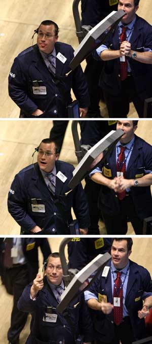 | 這張組合照片顯示了10月31日美國(guó)紐約證交所交易員緊張工作的場(chǎng)景。為化解次貸危機(jī)引發(fā)的經(jīng)濟(jì)衰退風(fēng)險(xiǎn),美聯(lián)儲(chǔ)31日決定再次降息25個(gè)基點(diǎn),將聯(lián)邦基金利率降至4.5%。受降息消息推動(dòng),當(dāng)天紐約三大股指全線上揚(yáng),道瓊斯指數(shù)上漲137.54點(diǎn),收于13930.01點(diǎn)。新華社/法新 | 金融市場(chǎng)的“蝴蝶效應(yīng)”