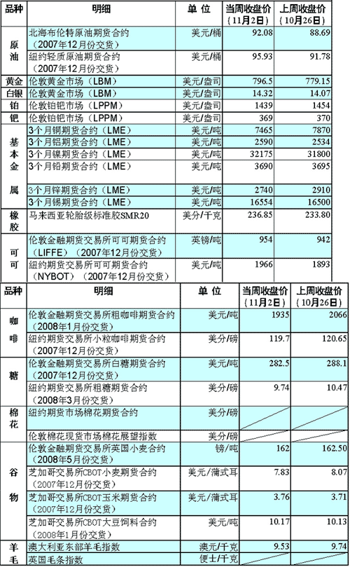 美元走軟、油價(jià)高企以及國(guó)際政治局勢(shì)趨緊,促使作為“硬通貨”的黃金再次成為投資者競(jìng)相追捧的對(duì)象。當(dāng)周倫敦市場(chǎng)黃金期貨價(jià)格自1980年來(lái)首次突破每盎司800美元關(guān)口。有關(guān)數(shù)據(jù)顯示,10月31日市場(chǎng)購(gòu)買黃金期貨的資金規(guī)模與8月31日的水平相比,已膨脹了16%,達(dá)到192.1億美元。與此同時(shí),黃金期貨價(jià)格上升了17%。 受美國(guó)原油商業(yè)庫(kù)存下降、美聯(lián)儲(chǔ)降息等因素影響,當(dāng)周紐約市場(chǎng)原油期貨價(jià)格三次刷新歷史最高紀(jì)錄,先后收于每桶93、94和95美元上方。美國(guó)能源部10月31日公布的報(bào)告稱,在截至10月26日的一周里,美國(guó)原油商業(yè)庫(kù)存猛降390萬(wàn)桶,而分析家原來(lái)預(yù)計(jì)的是增加10萬(wàn)桶,這對(duì)油市造成了明顯打壓。美聯(lián)儲(chǔ)當(dāng)周的降息決定促使美元進(jìn)一步走軟,美元對(duì)歐元匯率再創(chuàng)新低,從而進(jìn)一步提升了以美元計(jì)價(jià)的原油作為投資商品的吸引力。此外,原油加工能力的減弱也是造成油價(jià)上漲的因素之一。英國(guó)一家日加工能力為17.2萬(wàn)桶原油的煉油廠宣布,本周的一場(chǎng)火災(zāi)將可能使其停工1個(gè)月。 基本金屬價(jià)格當(dāng)周有漲有跌。其中,倫敦市場(chǎng)3個(gè)月銅期貨合約價(jià)格從前一周的每噸7870美元下跌至7465美元。分析人士稱,由于市場(chǎng)將美聯(lián)儲(chǔ)當(dāng)周作出的再次降息決定解讀為基本金屬消費(fèi)大國(guó)——美國(guó)經(jīng)濟(jì)增長(zhǎng)走緩的信號(hào),這種對(duì)需求減少的擔(dān)心導(dǎo)致了銅、鋅期貨價(jià)格下跌。 亞洲主產(chǎn)地的多雨天氣加重了投資者對(duì)橡膠供給趨緊的擔(dān)憂,致使當(dāng)周橡膠期貨價(jià)格繼續(xù)上揚(yáng)。分析人士稱,未來(lái)一周這種情況可能還將持續(xù)。由于玉米是制造乙醇這種生物燃料的重要原料,原油價(jià)格飆升和出口需求旺盛,使當(dāng)周芝加哥玉米期貨價(jià)格連續(xù)幾個(gè)交易日上漲。