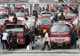 在印度尼西亞首都雅加達,卡車司機等待加油。(本報資料照片) |