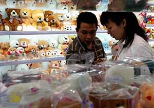 | 圖為一名美國客商在10月份舉行的第102屆中國進出口商品交易會(廣交會)展館中與工作人員商談玩具出口事宜。本報資料照片 | 關鍵詞一:貿易平衡發(fā)展