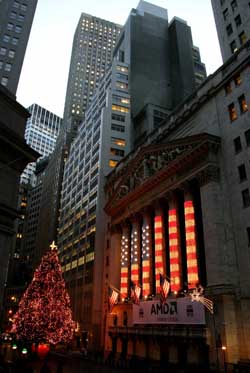 | 12日,美國(guó)紐約華爾街上的紐約證券交易所彩燈閃耀。 新華社記者 侯俊