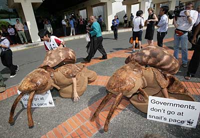 12月12日,在印度尼西亞巴厘島國際會議中心前,環(huán)保人士裝扮成蝸牛,旁邊的標語牌上寫著:“政府不要像蝸牛般爬行”。他們呼吁各國政府迅速采取行動,遏制全球氣候變暖。當日,聯(lián)合國氣候變化大會高級別會議在巴厘島開幕。