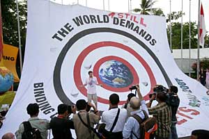 | 15日,在印度尼西亞巴厘島國際會議中心外,環(huán)保人士豎起一面面積達(dá)144平方米的標(biāo)靶圖案條幅,呼吁人們在2007年聯(lián)合國氣候變化大會結(jié)束之后繼續(xù)關(guān)注氣候變化問題。當(dāng)天,在這里舉行的聯(lián)合國氣候變化大會通過了“巴厘島路線圖”。新華社記者