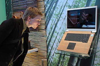 | 3月4日,在德國漢諾威信息及通信技術博覽會上,一名參觀者仔細觀看華碩電腦公司展示的部分用竹子做成的筆記本電腦。新華社記者