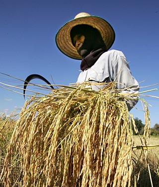 | 這是2004年11月18日,泰國東北部猜也蓬府的農(nóng)民在收割稻米。泰國是世界上最大的稻米出口國。新華社發(fā) | 隨著近期國際糧價(jià)不斷攀升,一些國家和組織開始著手采取對(duì)策,保障基本供給,盡力防止可能引發(fā)的糧食危機(jī)。