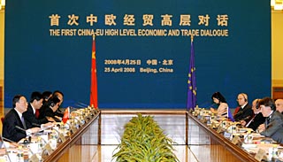 與去年11月在北京舉行的第十次中歐峰會(huì)時(shí)隔不到半年,巴羅佐再次率領(lǐng)歐洲委員會(huì)的各位委員來華訪問。中歐經(jīng)貿(mào)高層對(duì)話機(jī)制也正是在上次峰會(huì)上由中國政府提出,雙方?jīng)Q定,對(duì)話每年舉行一次,在中歐兩地輪流舉行。 近年來,中歐經(jīng)貿(mào)關(guān)系發(fā)展勢(shì)頭良好。歐盟已經(jīng)成為中國最大的貿(mào)易伙伴和最大的技術(shù)引進(jìn)來源地;中國也成為歐盟的第二大貿(mào)易伙伴和第四大出口市場(chǎng)。2007年,中歐貿(mào)易額3562億美元,同比增長(zhǎng)27%。今年一季度中歐貿(mào)易額939億美元,同比增長(zhǎng)24.7%。中國從歐盟共引進(jìn)技術(shù)2.7萬項(xiàng),合同金額1123億美元。歐盟企業(yè)對(duì)華投資近540億美元,已有近2.7萬家歐盟企業(yè)在中國深深扎根。與此同時(shí),中國企業(yè)也開始到歐盟投資!爸袣W作為當(dāng)今世界兩大市場(chǎng),都為對(duì)方經(jīng)濟(jì)發(fā)展提供了巨大的動(dòng)力!鄙虅(wù)部部長(zhǎng)陳德銘25日為英國《金融時(shí)報(bào)》撰文表示。 此次巴羅佐率領(lǐng)的訪華代表團(tuán)陣容空前龐大,包括負(fù)責(zé)對(duì)外關(guān)系、貿(mào)易、能源、環(huán)境、消費(fèi)者保護(hù)等方面在內(nèi)的9名歐委會(huì)委員以及其他官員共計(jì)60人。巴羅佐在25日舉行的新聞發(fā)布會(huì)上表示,歐委會(huì)這么多委員同時(shí)訪華,這還是第一次。他還說,此次訪問“非常有意義”,雙方在技術(shù)、能效合作及一些具體合作項(xiàng)目上取得了“明確”、“積極”的成果。 中國國務(wù)院副總理王岐山和歐盟歐洲委員會(huì)貿(mào)易委員曼德爾森于25日下午共同主持了首次中歐經(jīng)貿(mào)高層對(duì)話,雙方相關(guān)部門負(fù)責(zé)人圍繞貿(mào)易和投資合作、和諧與可持續(xù)發(fā)展、創(chuàng)新和技術(shù)、消費(fèi)者保護(hù)和產(chǎn)品安全、國際發(fā)展等5項(xiàng)議題進(jìn)行了坦誠交流,并就能源、知識(shí)產(chǎn)權(quán)、技術(shù)合作和貿(mào)易便利化等4個(gè)問題進(jìn)行了深入討論。“歐盟高度重視發(fā)展對(duì)華戰(zhàn)略合作,希望通過對(duì)話,加深相互了解,推進(jìn)互利合作,共同解決有關(guān)問題,使中歐經(jīng)貿(mào)關(guān)系平衡、順利發(fā)展”,曼德爾森說。