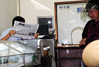 | 13日,在越南首都河內(nèi)市河中街一家外匯代理店,工作人員正在讀報(bào)。越南國家銀行近日出臺(tái)新規(guī)定加強(qiáng)了對(duì)外匯市場(chǎng)的監(jiān)控,使自由市場(chǎng)大部分外匯代理店生意日漸蕭條。本報(bào)記者