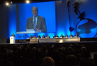| 6月30日,在西班牙首都馬德里,西班牙國(guó)王胡安·卡洛斯(左一)在第19屆世界石油大會(huì)上發(fā)言。本屆世界石油大會(huì)于6月29日至7月3日舉行。新華社記者