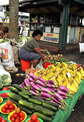 | 圖為斐濟(jì)首都蘇瓦的一個(gè)市場(chǎng),一名小販在賣(mài)果蔬。新華社記者 薛永興