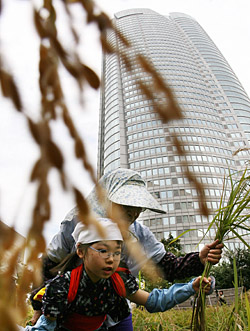 | 圖為2006年9月30日,在日本首都東京市中心的一處屋頂?shù)咎铮晃恍W(xué)生在農(nóng)民的幫助下收割稻米。新華社發(fā) | 在日本東京鬧市區(qū)的高層樓樓頂和地下室里,一壟壟新鮮蔬菜水果讓人誤以為置身在田間地頭。其實(shí),這是“城市農(nóng)民”的杰作。這一新興職業(yè)讓年輕人在大都市實(shí)現(xiàn)夢想。
