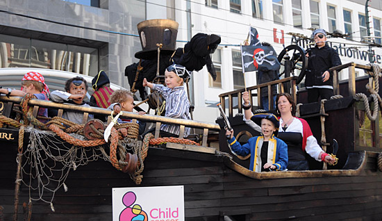16日,在新西蘭首都惠靈頓,參加游行的“海盜”花車駛過街頭。當天,惠靈頓市政府舉辦一年一度的圣誕大巡游活動,當?shù)孛癖娂娂娪可辖诸^,享受明媚陽光,感受圣誕氣氛。