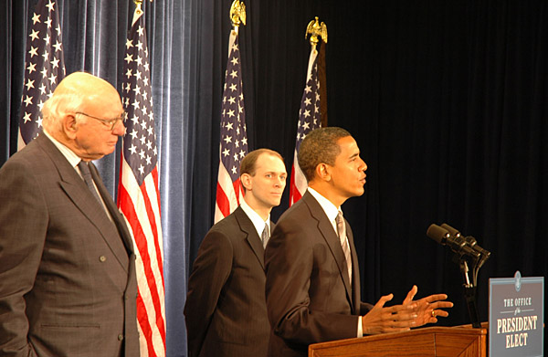 | 26日,美國(guó)當(dāng)選總統(tǒng)奧巴馬(右)在芝加哥召開的新聞發(fā)布會(huì)上講話。奧巴馬當(dāng)日宣布,將成立一個(gè)經(jīng)濟(jì)復(fù)蘇顧問(wèn)委員會(huì),并提名美國(guó)聯(lián)邦儲(chǔ)備委員會(huì)前主席保羅·沃爾克(左)來(lái)領(lǐng)導(dǎo)這一新的經(jīng)濟(jì)團(tuán)隊(duì)。新華社記者