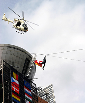 | 圖為2005年4月30日,一名特種兵在直升飛機的掩護下從歐盟委員會大樓的樓頂上沿繩索滑行而下進行反恐表演。新華社記者