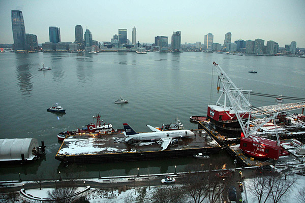 18日,在美國紐約,被打撈出哈得孫河的全美航空公司1549號航班客機在岸邊等待運輸,它將被運往新澤西州進(jìn)行進(jìn)一步的檢查。該客機15日下午因飛鳥撞擊導(dǎo)致引擎故障,墜入紐約哈得孫河。因機長沉著應(yīng)對和紐約應(yīng)急救援部門的快速反應(yīng),150名乘客以及5名機組人員全部獲救。新華社/路透