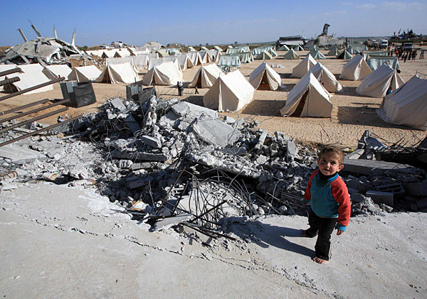 1月31日,在加沙地帶北部的賈巴利亞,一名兒童站在一個(gè)由帳篷組成的臨時(shí)居民點(diǎn)外。以軍持續(xù)22天的“鑄鉛行動(dòng)”導(dǎo)致加沙地帶大量建筑被損毀,而停火之后以色列對(duì)加沙的持續(xù)封鎖以及巴勒斯坦內(nèi)部對(duì)接受?chē)?guó)際援助問(wèn)題的分歧使得加沙重建工作進(jìn)展緩慢。