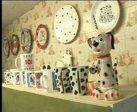 受到多迪·史密斯的小說《101斑點狗》及其相關電影和動畫片的影響,英國人卡倫·費里爾成為斑點狗極其相關產品的狂熱愛好者,F在,她已經是全英國有關“斑點狗”收藏品數量最多、種類最全的人。 更為有意思的是,自從卡倫·費里爾在1991年買了一條名叫迪托的斑點狗后,她喜愛的范圍就不再局限于斑點狗了,所有和斑點有關的物品都是她收藏的對象。 現在,卡倫·費里爾決定將她收集的這些與斑點有關的物品全部賣掉,目的是希望能夠和與她有相同愛好的人共同分享這些藏品。 一座位于南安普敦的普通房屋是卡倫·費里爾收藏斑點狗的樂園。門口有一輛斑點汽車,走進屋內,人們仿佛置身于斑點的世界。這里共有大約5000多件和斑點有關的收藏品,包括斑點臺燈、斑點氣球、斑點冰鞋、斑點餐具等。 44歲的卡倫·費里爾花了17年的時間收集到這些藏品,其中既有上世紀50年代的原裝玩具,也有電影《101斑點狗》的配套產品。卡倫的丈夫切斯對于妻子的愛好也十分理解。 在拍賣藏品的消息傳出后,很多和卡倫·費里爾有相同愛好的人都趕來,希望能夠分享這些收藏品?▊悺べM里爾表示,她的每一件藏品都包含著一段美好的故事,她非常希望購買收藏品的人能把這些故事一起帶回家。