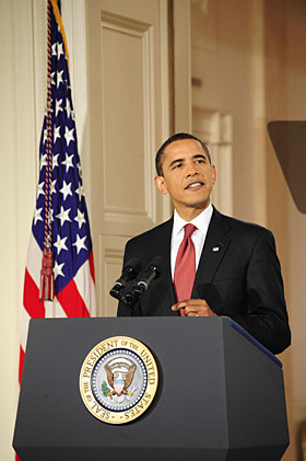 攝 | 美國總統(tǒng)貝拉克·奧巴馬9日晚舉行就任以來首次黃金時間段新聞發(fā)布會。 奧巴馬為國會審議中的8000億美元經(jīng)濟刺激計劃大力辯護,稱自己不能坐視美國經(jīng)濟從危機滑向災(zāi)難。 他說,確保就業(yè)是經(jīng)濟刺激計劃的“底線”,而聯(lián)邦政府是激活經(jīng)濟的中堅力量。