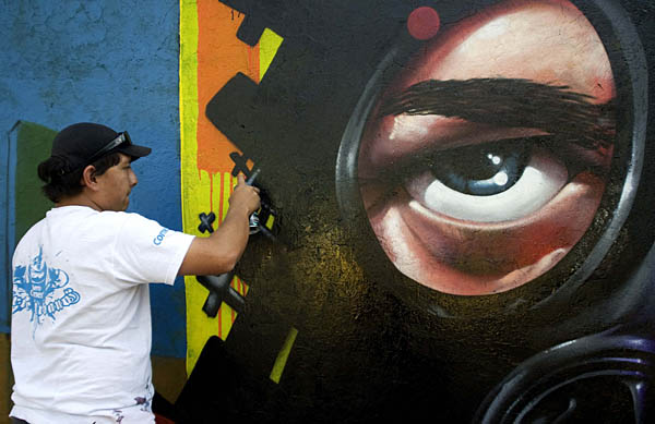 15日,在墨西哥首都墨西哥城舉行的一場涂鴉比賽上,一名男子專心在墻上創(chuàng)作。新華社/路透
