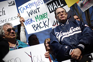 | 21日,在美國康涅狄格州美國國際集團(tuán)(AIG)總部外,抗議者手舉“納稅人想要回他們的錢”等牌板。當(dāng)天,康涅狄格州一個(gè)勞工團(tuán)體組織金融危機(jī)受害者前往AIG總部,抗議AIG在接受美國政府巨額資金援助的情況下仍向部分高管和員工發(fā)放高額獎(jiǎng)金。新華社/路透 | 美國康涅狄格州總檢察長理查德·布盧門塔爾21日說,保險(xiǎn)業(yè)巨頭美國國際集團(tuán)(AIG)提交文件顯示,公司前一周(指9日至15日)共發(fā)放2.18億美元獎(jiǎng)金,比先前公布數(shù)額多5300萬美元。他要求公司作出解釋。 AIG發(fā)放巨額獎(jiǎng)金一事引發(fā)眾怒,美國19州宣布展開聯(lián)合調(diào)查。但白宮發(fā)言人說,總統(tǒng)貝拉克·奧巴馬可能會(huì)在獎(jiǎng)金征收重稅問題上態(tài)度有所緩和,以確保相關(guān)公司不會(huì)退出政府金融業(yè)救助計(jì)劃。