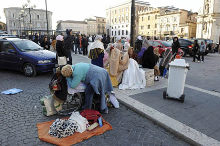 6日,在意大利中部拉奎拉省,一些當(dāng)?shù)鼐用衽鹤釉趶V場上躲避可能來臨的余震。意大利中部地區(qū)6日凌晨發(fā)生強(qiáng)烈地震,造成重大人員傷亡和財產(chǎn)損失。