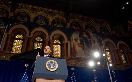 14日,美國(guó)總統(tǒng)奧巴馬在首都華盛頓喬治敦大學(xué)發(fā)表演講。新華社/法新 |